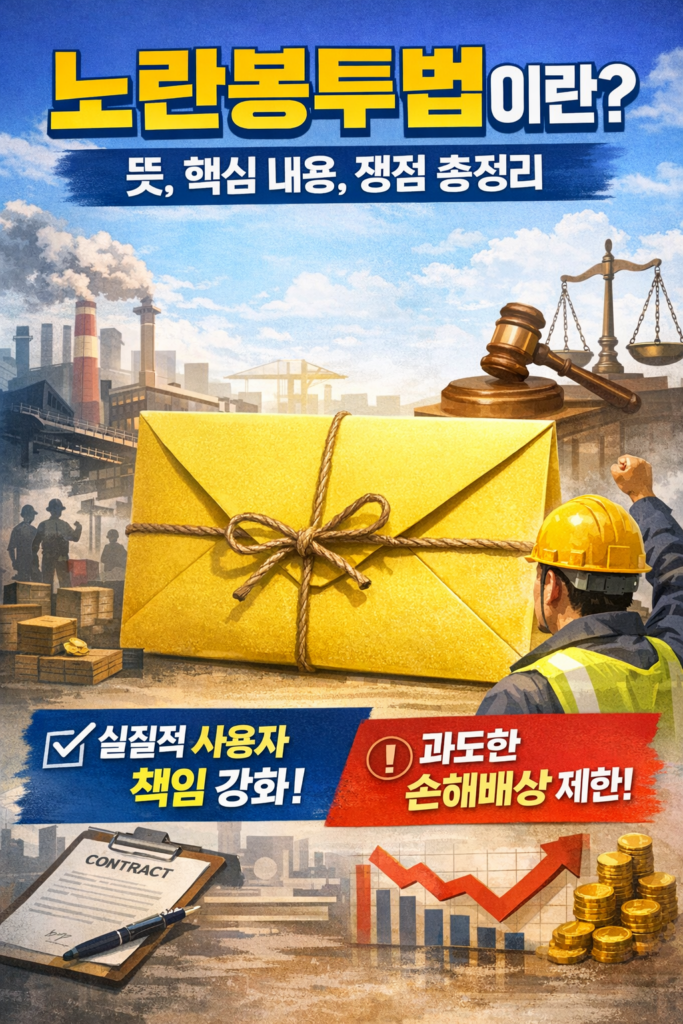 뉴스를 보다 보면 한동안 자주 들리는 법안 이름이 있습니다. 바로 노란봉투법입니다. 이름만 들으면 따뜻하고 감성적인 느낌이 있지만, 실제 내용은 우리 사회의 노동 문제와 기업 책임, 그리고 노사 갈등 구조와 깊게 연결되어 있는 매우 현실적인 법입니다. 그래서 많은 사람들이 “노란봉투법이란 무엇인가”, “왜 이런 이름이 붙었는가”, “도대체 무엇이 바뀌는가”, “왜 찬반 논란이 이렇게 큰가”를 궁금해합니다.